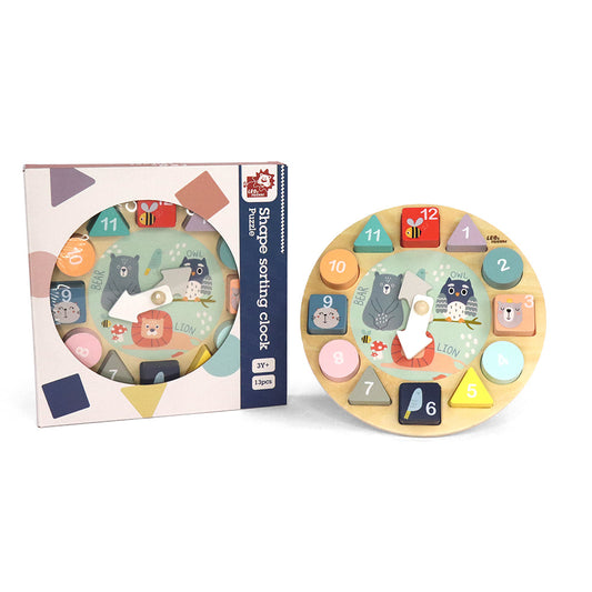 Leo & Friends Wooden Shape Sorting Clock with 12 Removable Blocks