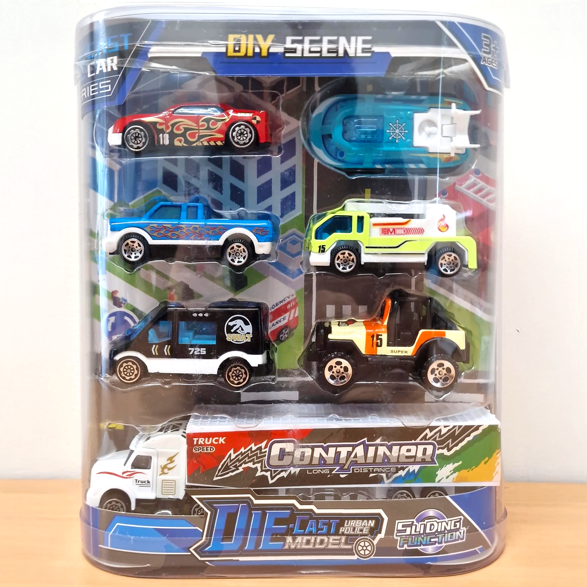 6 die-cast alloy vehicles including cars, jeep, ambulance, SWAT van & truck